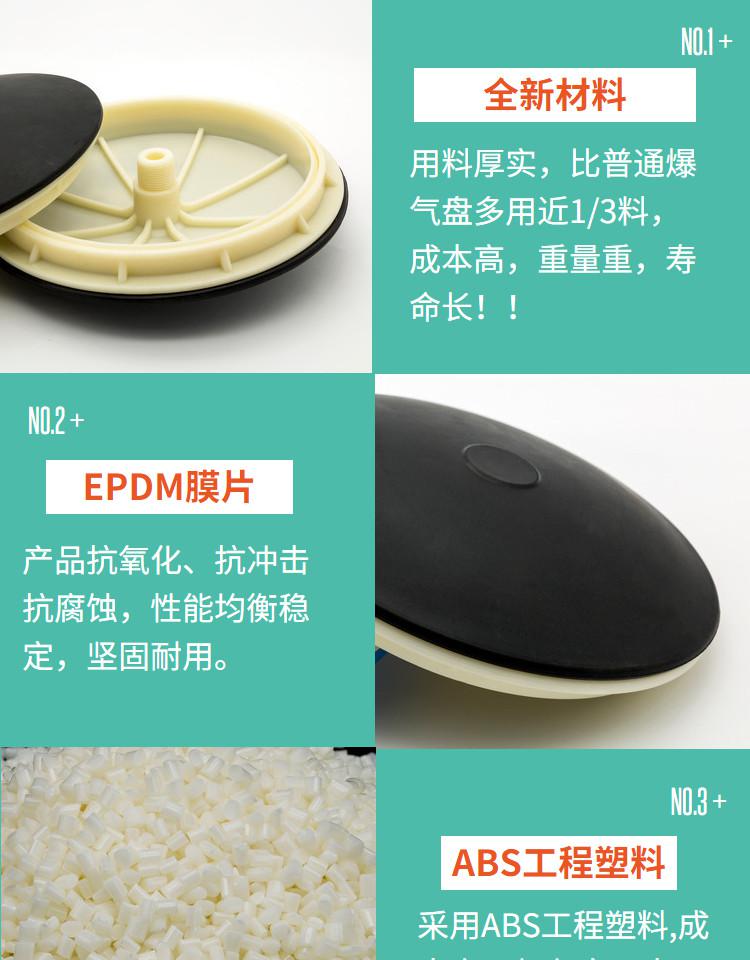 曝氣盤是膜式微孔曝氣產(chǎn)品。采用ABS工程塑料為底盤、托板,布?xì)饽て扇冶z(EPDM)材料制成,曝氣裝置由曝氣器、調(diào)節(jié)器、連接件和布?xì)夤艿?、三通、四通、彎頭等管件連接組成。