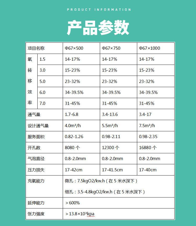 1.曝氣膜管采用三元乙丙橡膠(EPDM)材料,具有耐熱、耐臭氧、耐酸堿、化學(xué)穩(wěn)定性好等特點(diǎn),與一般橡膠膜相比,可大大提高其使用壽命。