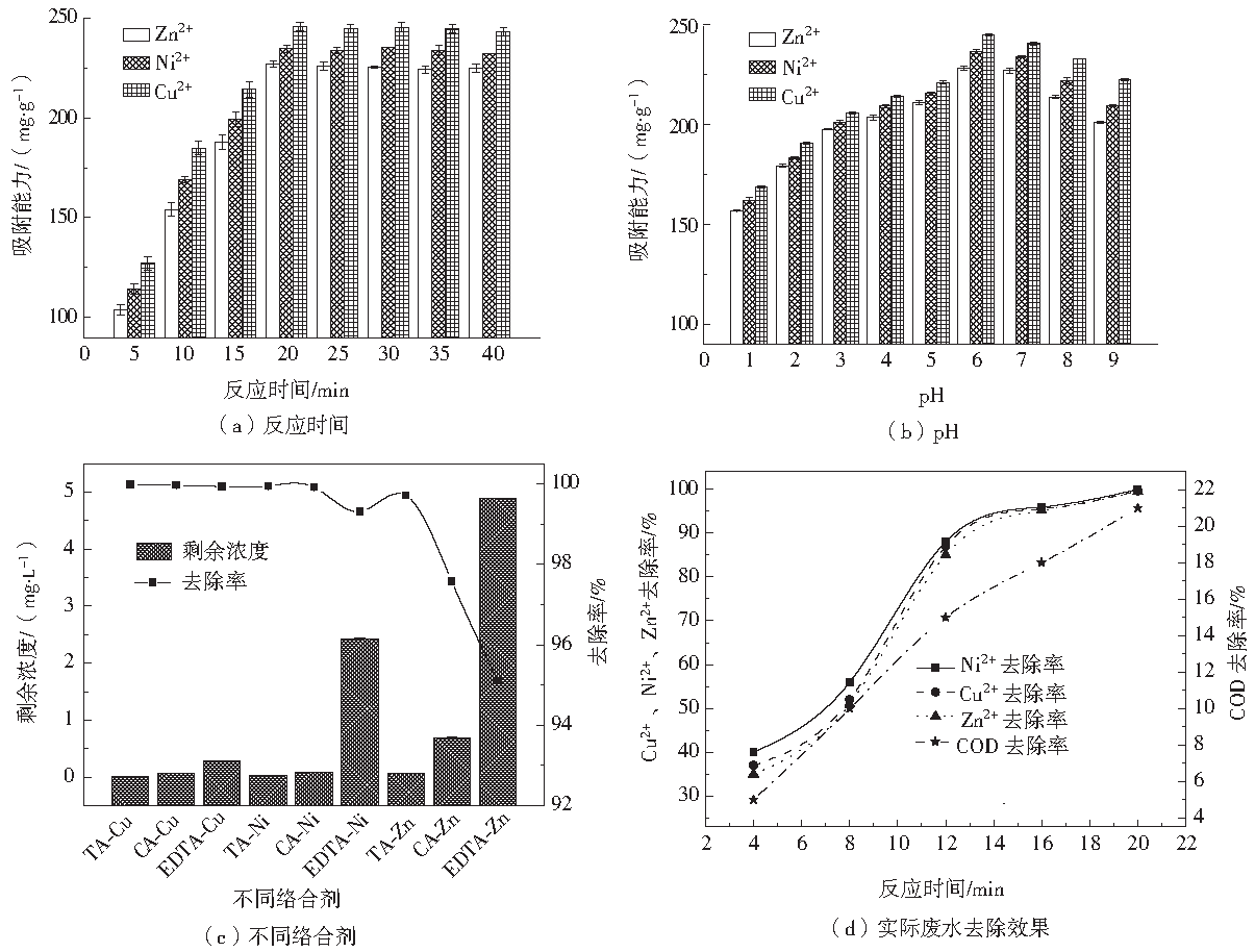圖4(d)表示的是實(shí)際廢水的處理效果。實(shí)驗(yàn)結(jié)果表明,當(dāng)吸附時(shí)間達(dá)到20 min時(shí),Cu2+, Ni2+, Zn2+去除率分別達(dá)到99.95%、99.94%、99.84%,剩余濃度分別為0.07、0.09 和0.34 mg·L−1,均在國家排放標(biāo)準(zhǔn)以下(Cu 0.3 mg·L−1,Ni 0.1 mg·L−1,Zn 1.0 mg·L−1)。此外,PADTC還能去除21%的COD (廢水初始COD為301.25 mg·L−1,反應(yīng)過后COD為 237.99 mg·L−1),這可能是因?yàn)楦叻肿泳酆衔镏g的吸附架橋作用去除了廢水中的部分有機(jī)物。