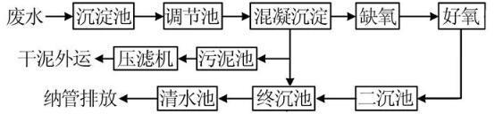 將原有調(diào)節(jié)池與缺氧池合并為新的調(diào)節(jié)池,在新調(diào)節(jié)池內(nèi)設(shè)置鼓風(fēng)曝氣系統(tǒng),在充分調(diào)節(jié)水質(zhì)水量的同時(shí),保證油類及懸浮物等污染物不會(huì)上浮;出水經(jīng)地上泵提升至氣浮裝置,在氣浮裝置內(nèi)進(jìn)行部分加壓溶氣氣浮預(yù)處理,去除廢水中大部分油類污染物、大量懸浮物SS等,以減少后續(xù)電解還原Fenton電極板清洗頻次,并降低后續(xù)處理負(fù)荷。氣浮裝置出水自流進(jìn)入電解還原Fenton裝置,通過(guò)外加電場(chǎng)作用該廢水,由于該廢水中含Cl-質(zhì)量濃度高、導(dǎo)電性良好,外加電場(chǎng)后,聯(lián)合化學(xué)藥劑共同作用,化學(xué)反應(yīng)劇烈,可對(duì)廢水中大分子有機(jī)污染物進(jìn)行氧化分解;電解還原Fenton裝置出水自流進(jìn)入快沉裝置,通過(guò)調(diào)節(jié)pH使大量污泥沉淀;快沉裝置上清液自流進(jìn)入?yún)捬醭?,通過(guò)厭氧微生物的新陳代謝作用去除廢水中難降解的有機(jī)污染物;厭氧池出水經(jīng)地上泵提升至MBR裝置,通過(guò)好氧微生物的作用進(jìn)一步降解廢水中的有機(jī)污染物,同時(shí)利用MBR膜組件的截留功能維持MBR裝置內(nèi)較高的污泥濃度,以增強(qiáng)系統(tǒng)的耐沖擊負(fù)荷能力;MBR裝置出水經(jīng)出水泵抽至出水桶,達(dá)標(biāo)后納管排放。